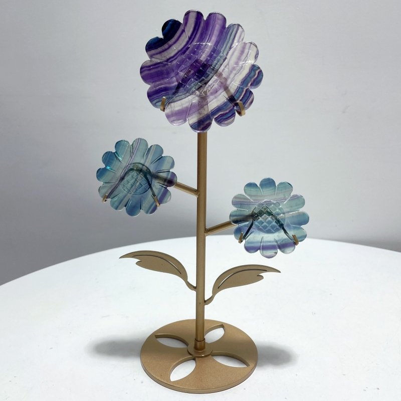 We sell our flower carving with stand in lots that are 3pcs, you will get the same of stones as in the photo and video.