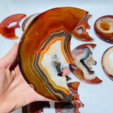 We sell our large carnelian moon face carving in lots that are 12pcs,you will get the same of stones as in the photo and video.